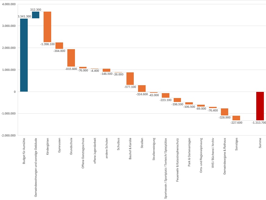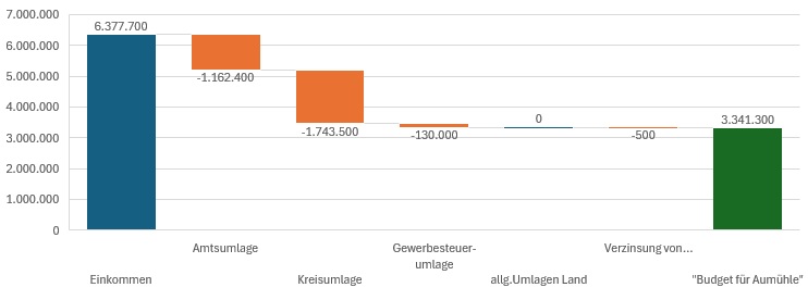 Die großen Ausgabenblöcke sind die Amts- bzw. Kreisumlage mit 2,9 Mio. Euro (+0,3 Mio. Euro), die Kindergärten mit ca. 1,4 Mio. Euro (+0,1 Mio. Euro), Kosten für die Schulen mit weiteren ca. 1,3 Mio Euro, die Straßenunterhaltung (ohne Investitionen) mit 324.000 Euro, sowie der Bauhof und der Unterhalt der Abwasserkanäle mit ca. 580.000 Euro.